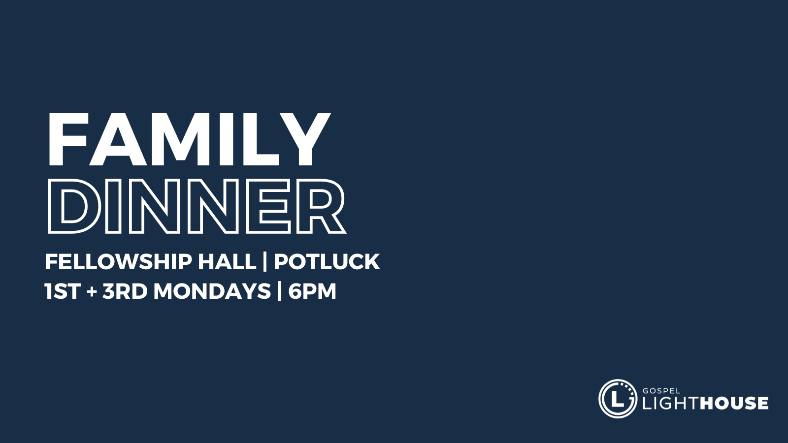 Family Dinner Join us for our bi-monthly Family Dinner every first and third Monday of the month at 6pm! All ages are welcome to attend. Bring a dish to share as we listen to a Word and fellowship! + Add to Google Calendar + iCal / Outlook export 00 days 00 hours 00 minutes 00 seconds Date Apr 20 2026 Time 6:00 pm - 7:00 pm Share this event